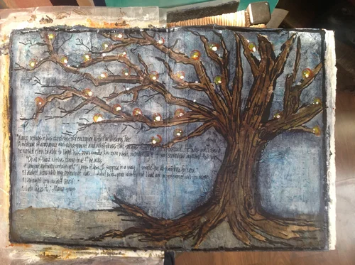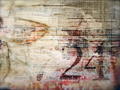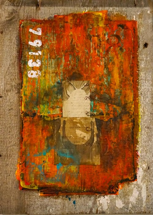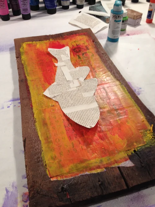 11"x17" submission. Mixed media (wood, paper, distress ink, encaustic).