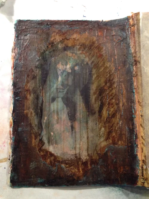 2014 submission titled "Verdigris". 17" x 21" collage and mixed media (paper, acrylic paint, distress, spackle) on reclaimed lumber.